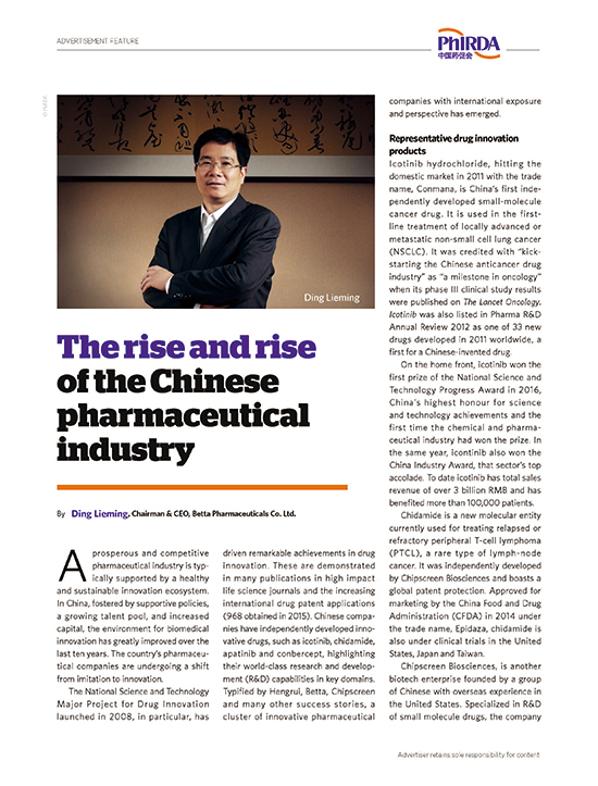 最新一期《nature》杂志刊发了一组中国医药创新促进会、中国医药创新企业家和专家的文章,全方位展示了中国医药创新走向世界舞台的光辉历程。其中,公司董事长丁列明博士作为中国医药创新领军人物,受邀撰写了题为《中国制药产业的崛起》(The rise and rise of the Chinese pharmaceutical industry)的文章。他在文中结合公司荣获国家科技进步一等奖的1.1类新药凯美纳的研制,深入剖析了中国医药创新领域取得的巨大成就、优越的创新环境和未来发展方向,生动诠释了中国制药产业的崛起,充分彰显了中国制药产业在全球医药创新领域中的重要地位。