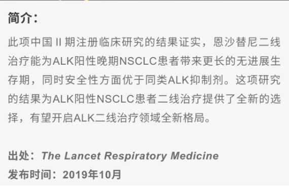这项评价恩沙替尼胶囊治疗克唑替尼耐药的ALK阳性非小细胞肺癌患者疗效和安全性的II期单臂、多中心临床研究,由中山大学肿瘤防治中心主任张力教授牵头,共有27家国内医学中心参与,受试者为18周岁以上,在克唑替尼治疗期间出现疾病进展的局部晚期或转移性(IIIB或IV期)ALK阳性NSCLC患者,主要研究终点是独立审查委员会评估的客观反应率(ORR)。此项临床研究的结果证实,恩沙替尼二线治疗能为ALK阳性晚期NSCLC患者带来更长的无进展生存期,同时安全性优于同类ALK抑制剂。此项研究的结果为ALK阳性NSCLC患者二线治疗提供了全新的选择,有望开启ALK二线治疗领域的全新格局。2019年10月16日,国际顶尖医学期刊、影响因子达22.992分的《柳叶刀·呼吸医学》(The Lancet Respiratory MediCIne)在线发表了该项研究成果(12月底正式书面发表)。同期,国际知名癌症专家、美国科罗拉多大学Ross Camidge教授发表编者按,评价恩沙替尼疗效确切、安全,只需一天服药一次,是ALK突变晚期肺癌的二线治疗新选择,并随着一线治疗研究的推进,可能成为一线治疗用药。