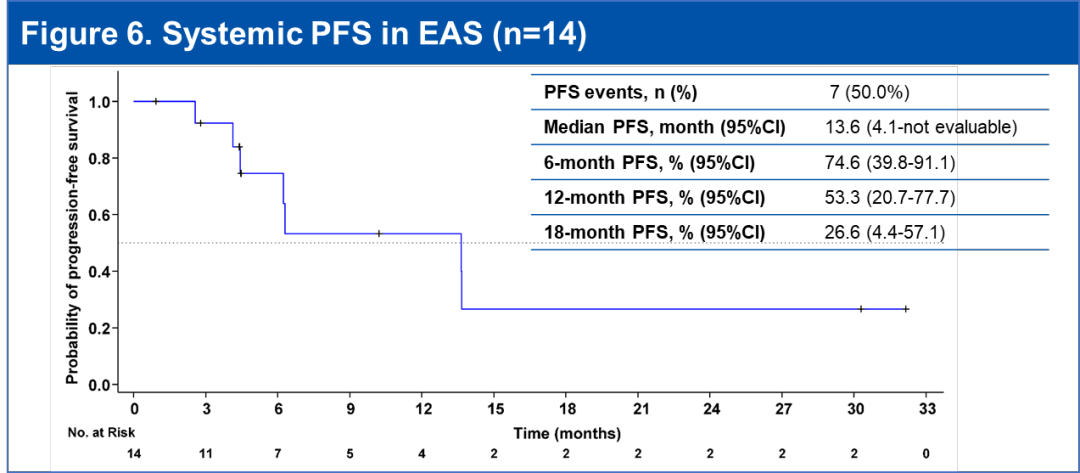 ●截至2023年3月24日,共有17例患者入组,其中14例患者接受恩沙替尼治疗并有≥1次的疗效评估,可用于疗效/安全分析。患者中位年龄为55岁,71.4%为女性。1例(7%)患者为恩沙替尼一线治疗,其余13例(93%)患者为恩沙替尼二线治疗(前线为克唑替尼治疗)。中位随访时间为13.9个月(范围,4.4-47.5)。其中6例(42.9%)患者依然在组治疗。