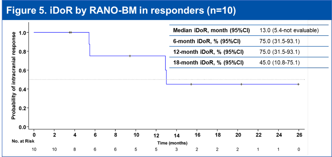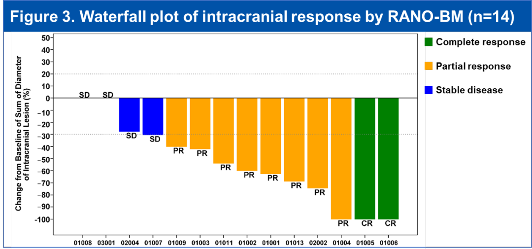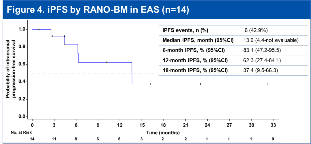 ●疗效:主要终点指标iORR为71.4%(95%CI, 41.9%-91.6%),2例(14.3%)完全缓解(CR),8例(57.1%)部分缓解(PR)。4例患者疾病稳定(SD),iDCR为100%(95%CI, 76.8%-100.0% )。基于6例iPFS事件数,中位iPFS达到13.6个月(95%CI, 4.4-not evaluable [NE] )。10例肿瘤缓解患者中,中位iDoR为13.0个月(95%CI, 5.4-NE)。中位全身性PFS为13.6个月,1年PFS率为53.3%。总生存期尚未成熟。MMSE未发生变化(相对基线≤3分改变)。中位CSF/血浆药物浓度比为1.52%。